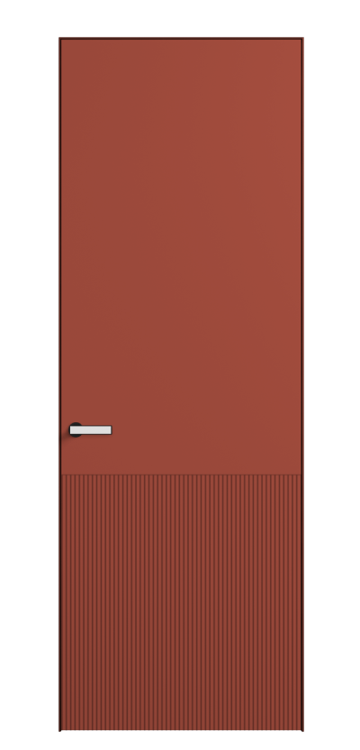 Это полотна с рельефной фрезеровкой. Этот прием делает интерьер объемным, тактильным, вносит интересную текстуру и создает современный образ. Волнистый рельеф может быть выполнен по ламелям из массива дуба в древесных матовых отделках, либо исполнен по натуральному и экологически безопасному материалу — ХДФ, покрытому гладкой эмалью актуальных оттенков.