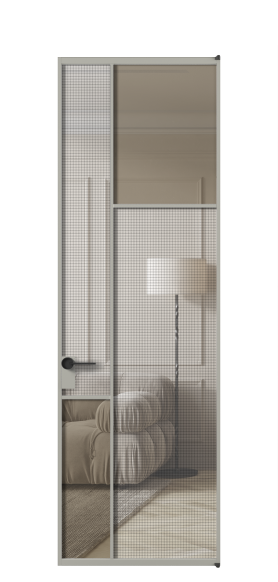 АЛПЛ041.11 Алюминий нейтральный серый Декоративное стекло с сеткой "Mesh silver", триплекс, 6 мм + Прозрачное бронзовое стекло, триплекс