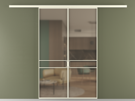 Во всех алюминиевых перегородках, независимо от типа установки, используется компланарный раздвижной механизм, благодаря которому декоративная крышка и полотно находятся в одной плоскости.