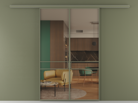 Во всех алюминиевых перегородках, независимо от типа установки, используется компланарный раздвижной механизм, благодаря которому декоративная крышка и полотно находятся в одной плоскости.