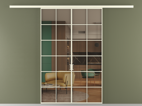Во всех алюминиевых перегородках, независимо от типа установки, используется компланарный раздвижной механизм, благодаря которому декоративная крышка и полотно находятся в одной плоскости.