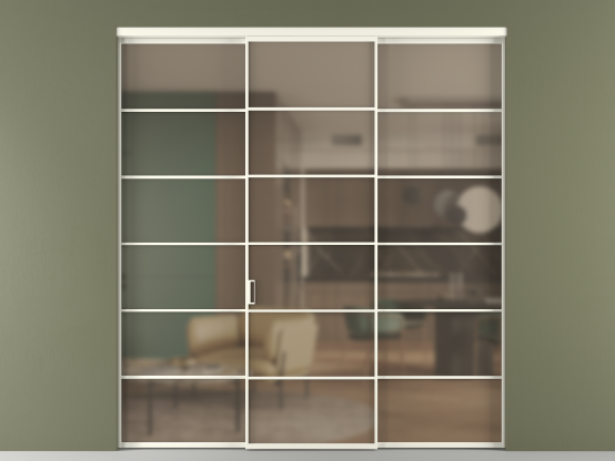 Во всех алюминиевых перегородках, независимо от типа установки, используется компланарный раздвижной механизм, благодаря которому декоративная крышка и полотно находятся в одной плоскости.