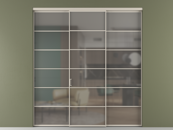Во всех алюминиевых перегородках, независимо от типа установки, используется компланарный раздвижной механизм, благодаря которому декоративная крышка и полотно находятся в одной плоскости.
