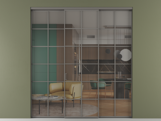 Во всех алюминиевых перегородках, независимо от типа установки, используется компланарный раздвижной механизм, благодаря которому декоративная крышка и полотно находятся в одной плоскости.
