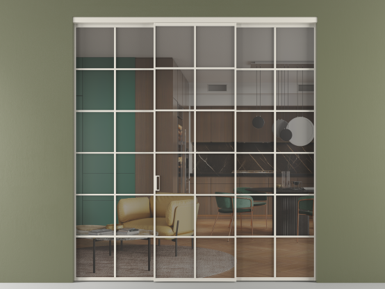 Во всех алюминиевых перегородках, независимо от типа установки, используется компланарный раздвижной механизм, благодаря которому декоративная крышка и полотно находятся в одной плоскости.