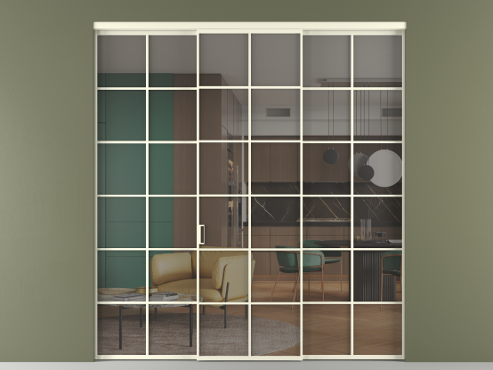 Во всех алюминиевых перегородках, независимо от типа установки, используется компланарный раздвижной механизм, благодаря которому декоративная крышка и полотно находятся в одной плоскости.