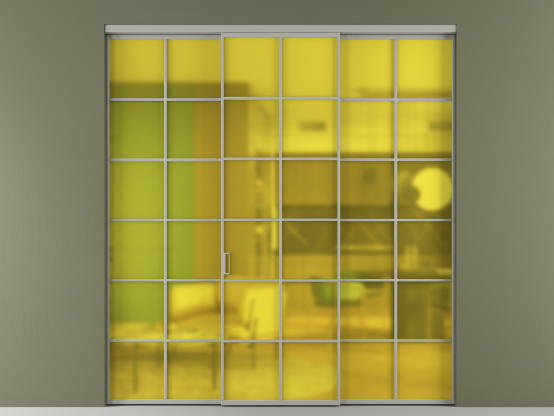 Во всех алюминиевых перегородках, независимо от типа установки, используется компланарный раздвижной механизм, благодаря которому декоративная крышка и полотно находятся в одной плоскости.