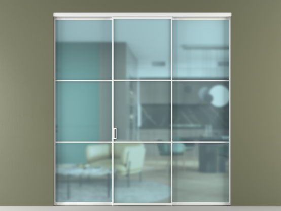 Во всех алюминиевых перегородках, независимо от типа установки, используется компланарный раздвижной механизм, благодаря которому декоративная крышка и полотно находятся в одной плоскости.
