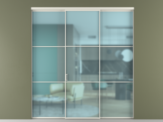 Во всех алюминиевых перегородках, независимо от типа установки, используется компланарный раздвижной механизм, благодаря которому декоративная крышка и полотно находятся в одной плоскости.