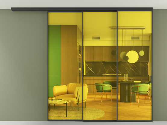 Мы предлагаем девять вариантов декоративного стекла: от кристально-прозрачного до матовых цветных, а также стёкла с эффектом Stopsol, когда лицевая сторона стекла зеркальная, но при включенном освещении за стеклом — становится прозрачной.