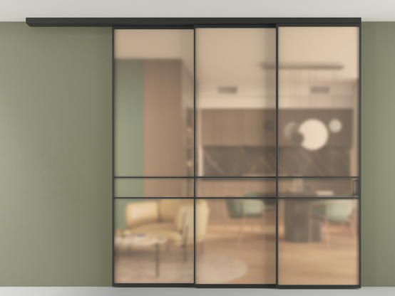 Во всех алюминиевых перегородках, независимо от типа установки, используется компланарный раздвижной механизм, благодаря которому декоративная крышка и полотно находятся в одной плоскости.