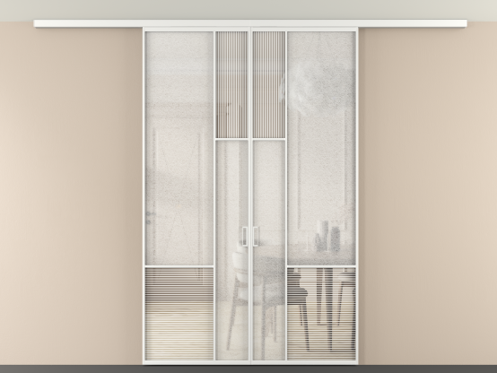 Дополнительно на раздвижную двустворчатую перегородку вдоль стены и четырехстворчатую перегородку внутри проема с двумя неподвижным полотнами можно установить механизм синхронного открывания — при открывании одной створки, вторая открывается автоматически.