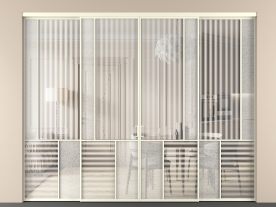 Дополнительно на раздвижную двустворчатую перегородку вдоль стены и четырехстворчатую перегородку внутри проема с двумя неподвижным полотнами можно установить механизм синхронного открывания — при открывании одной створки, вторая открывается автоматически.
