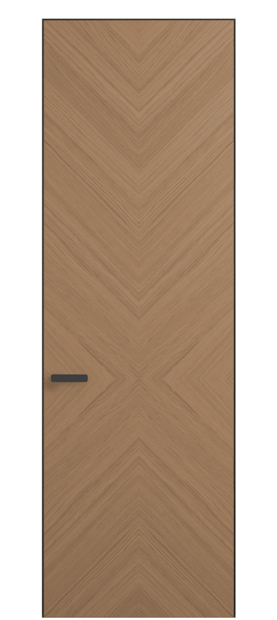 Полотно Рифт в скрытом алюминиевом коробе становится полноценным элементом декора. В коллекции представлено 9 моделей дверей в высоте до 3 метров. Рисунок раскладки шпона варьируется от простого до сложного. «Рубашка» для каждого полотна подбирается вручную по цвету, текстуре и фактуре.