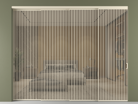 Дополнительно на раздвижную двустворчатую перегородку вдоль стены и четырёхстворчатую перегородку внутри проёма с двумя неподвижным полотнами можно установить механизм синхронного открывания — при открывании одной створки, вторая открывается автоматически.