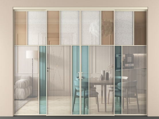 Дополнительно на раздвижную двустворчатую перегородку вдоль стены и четырехстворчатую перегородку внутри проема с двумя неподвижным полотнами можно установить механизм синхронного открывания — при открывании одной створки, вторая открывается автоматически.