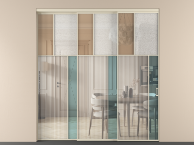 Дополнительно на раздвижную двустворчатую перегородку вдоль стены и четырехстворчатую перегородку внутри проема с двумя неподвижным полотнами можно установить механизм синхронного открывания — при открывании одной створки, вторая открывается автоматически.