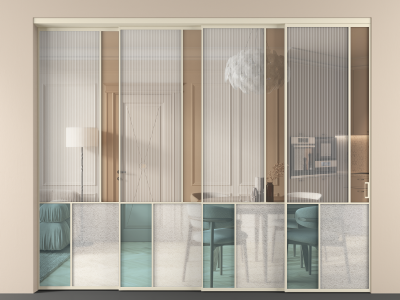 Во всех алюминиевых перегородках, независимо от типа установки, используется компланарный раздвижной механизм, благодаря которому декоративная крышка и полотно находятся в одной плоскости.