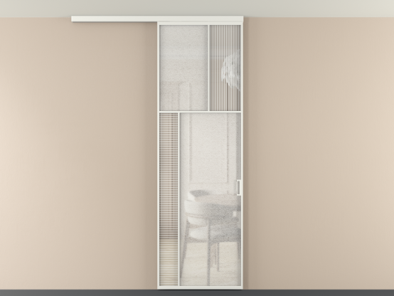 Во всех алюминиевых перегородках, независимо от типа установки, используется компланарный раздвижной механизм, благодаря которому декоративная крышка и полотно находятся в одной плоскости.