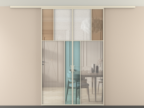 Дополнительно на раздвижную двустворчатую перегородку вдоль стены и четырехстворчатую перегородку внутри проема с двумя неподвижным полотнами можно установить механизм синхронного открывания — при открывании одной створки, вторая открывается автоматически.