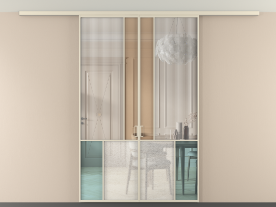 Во всех алюминиевых перегородках, независимо от типа установки, используется компланарный раздвижной механизм, благодаря которому декоративная крышка и полотно находятся в одной плоскости.