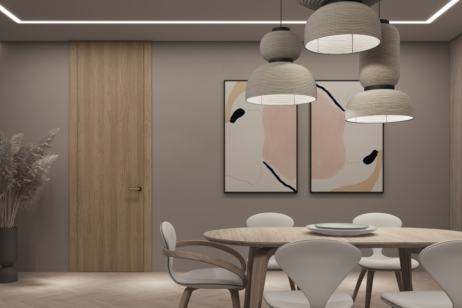 Это полотна с рельефной фрезеровкой. Этот прием делает интерьер объемным, тактильным, вносит интересную текстуру и создает современный образ. Волнистый рельеф может быть выполнен по ламелям из массива дуба в древесных матовых отделках, либо исполнен по натуральному и экологически безопасному материалу — ХДФ, покрытому гладкой эмалью актуальных оттенков.