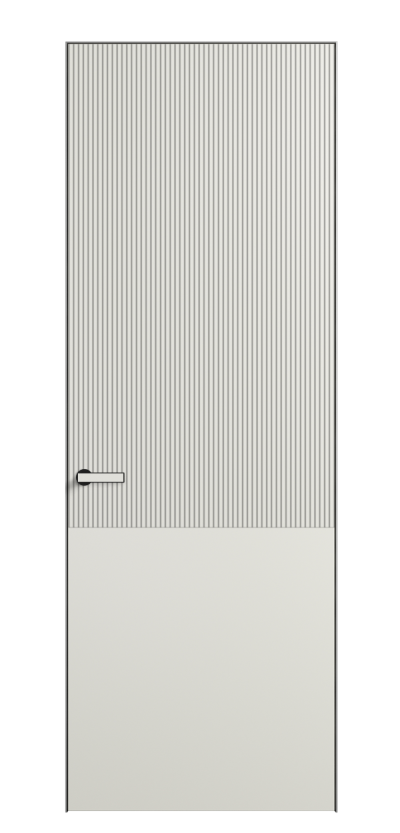 Это полотна с рельефной фрезеровкой. Этот прием делает интерьер объемным, тактильным, вносит интересную текстуру и создает современный образ. Волнистый рельеф может быть выполнен по ламелям из массива дуба в древесных матовых отделках, либо исполнен по натуральному и экологически безопасному материалу — ХДФ, покрытому гладкой эмалью актуальных оттенков.